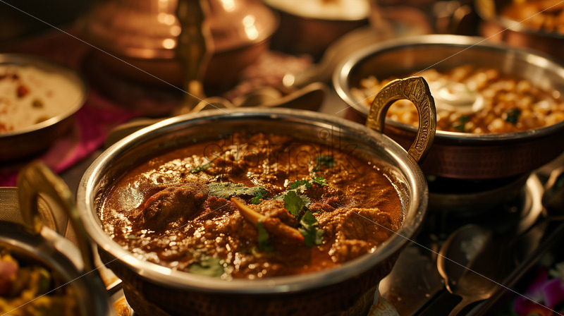 A captivating photograph immersing you in the world of rich and flavorful Indian curry, showcasing a variety of dishes with meat or vegetables cooked in a spiced sauce. The delectable curries are thoughtfully arranged in a bowl or on a plate, adorned with garnishes like cilantro or a swirl of yogurt. The scene is set in either a traditional Indian dining room or a vibrant street food market, bathed in warm, soft light that artfully highlights the dish’s vibrant colors. Traditional Indian elements, including brass utensils, aromatic spices, and colorful fabrics, contribute to the cultural richness of this gastronomic experience.
