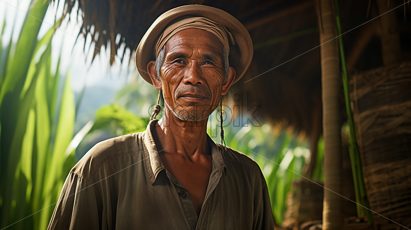Home » Shop » Uncategorised » Indonesian Farmer in the rice filed of Bali Indonesia standing beside nipa hut wearing a farmer hat looking contented