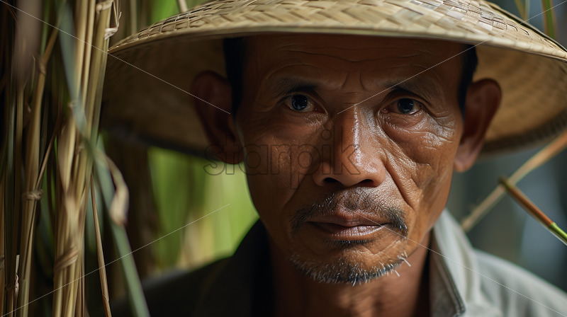Indonesian Farmer in the rice filed of Bali Indonesia wearing his farmer hat