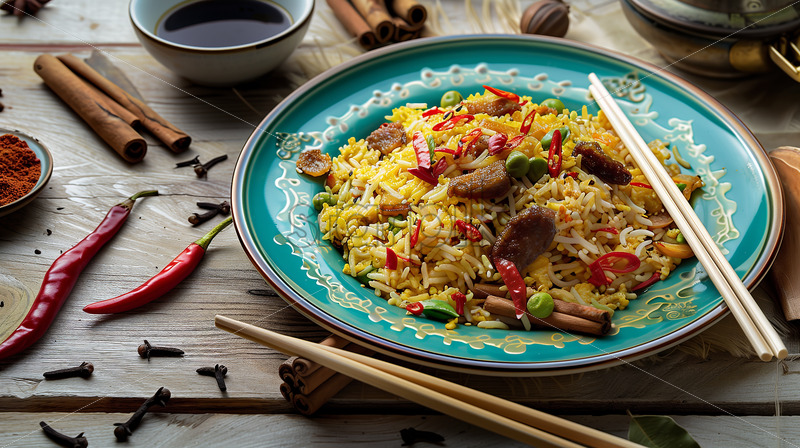 Nasi Goreng surrounded by traditional Indonesian spices like cloves, cinnamon sticks, and chili peppers.