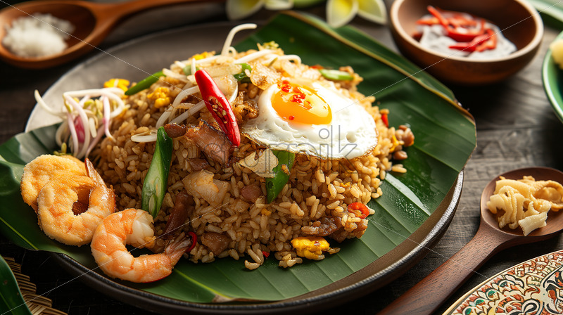 The fried rice, richly adorned with a medley of meats and vegetables, drizzled with sweet soy sauce.