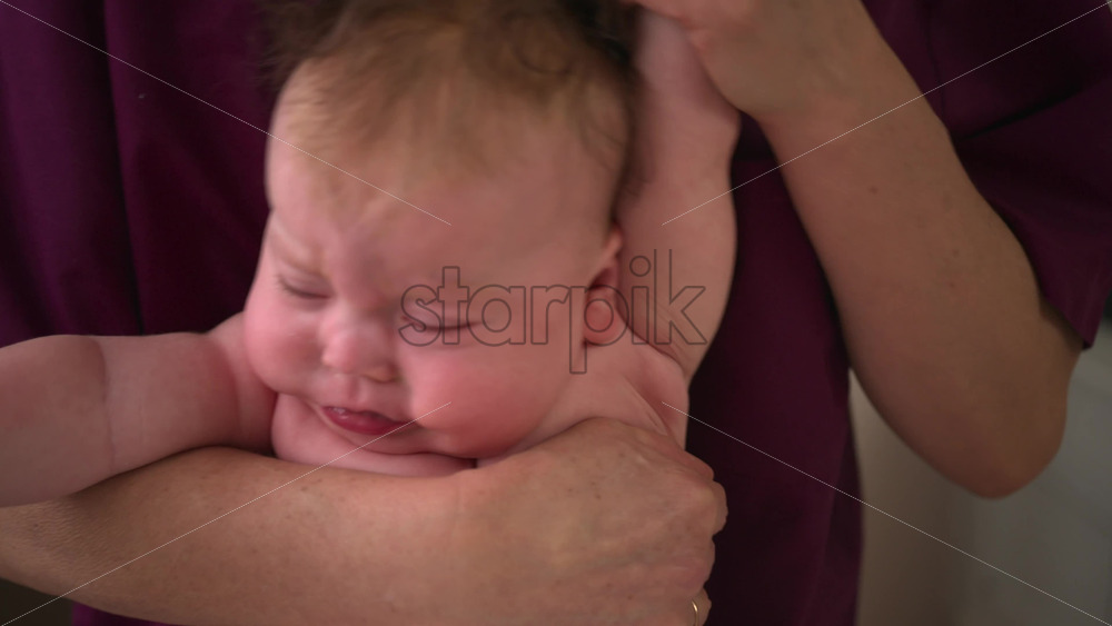Baby resting on a caregiver’s lap during a care routine. Vertical