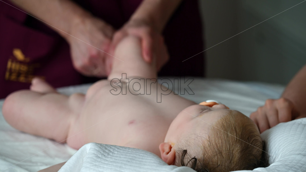 Infant lying relaxed on a bed, looking upward while a caregiver massages and performs mobility exercises