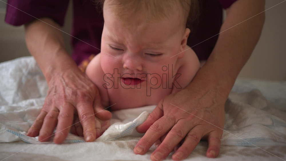 Infant placed on a soft surface practicing tummy time, supported gently by adult hands