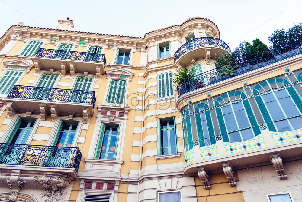 Home » Shop » photo » Interesting yellow house on the streets of Cannes. Garden on the roof. Colourful building. French architecture. Wide angle shot