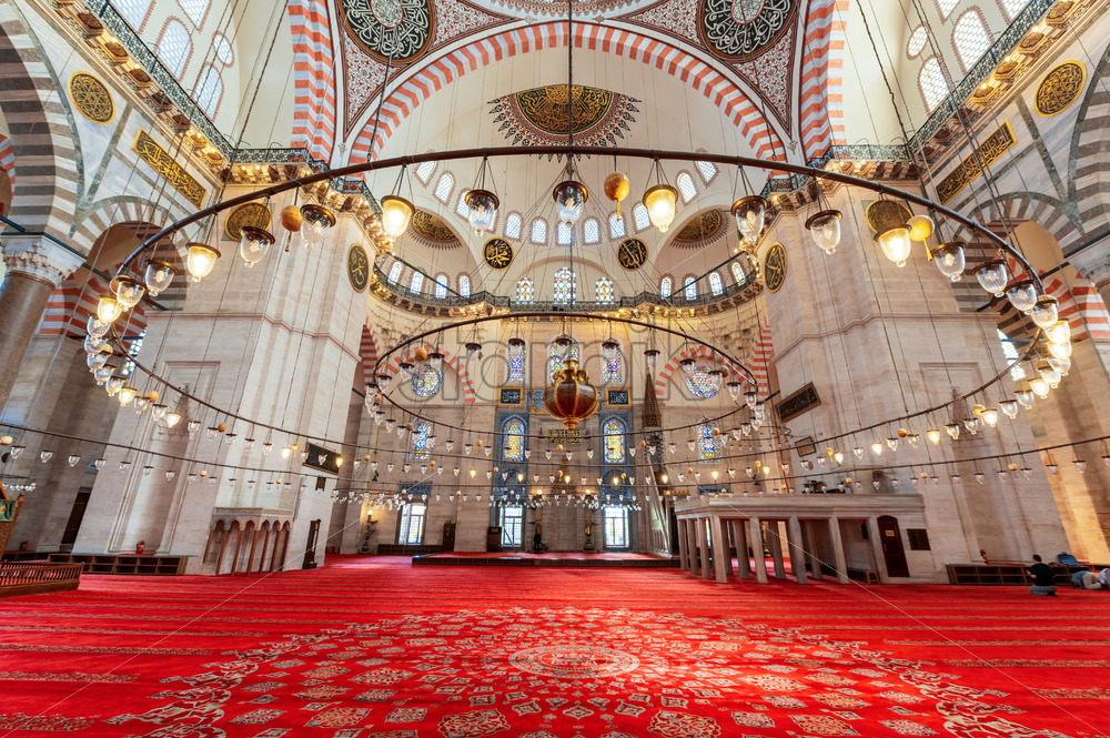 Home » Shop » photo » Interior view of the Suleymaniye mosque in Istanbul, Turkey. A lot of illumination, painted ceiling