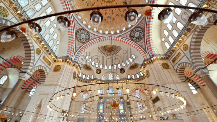 Interior view of the Suleymaniye mosque in Istanbul, Turkey. A lot of illumination, painted ceiling Royalty Free Stock Video Footage