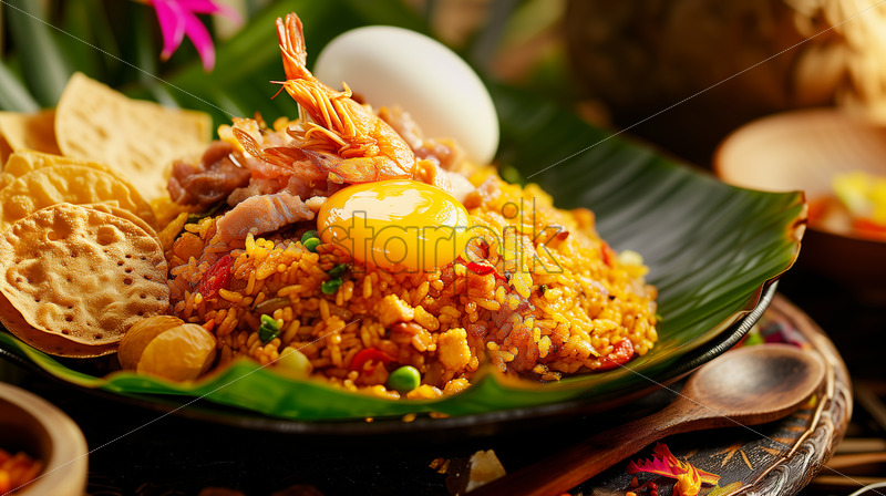 Flavorful fried rice, adorned with meats and vegetables, and sweet soy sauce, is elegantly presented on a banana leaf.
