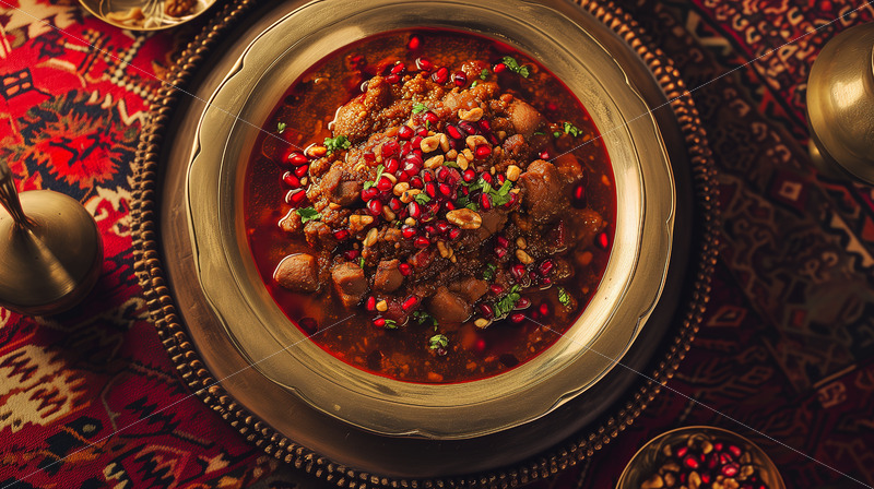 Iranian Fesenjan stew, combining ground walnuts, pomegranate molasses, and poultry, elegantly served with garnishes in a deep dish.