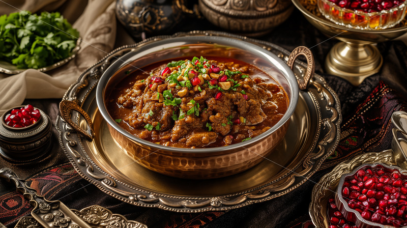 Home » Shop » Uncategorised » Iranian Fesenjan in a deep dish with garnishes