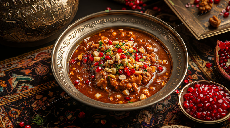 Iranian Fesenjan, a rich walnut and pomegranate molasses stew with poultry, elegantly served in a deep dish, garnished with pomegranate seeds and chopped walnuts.