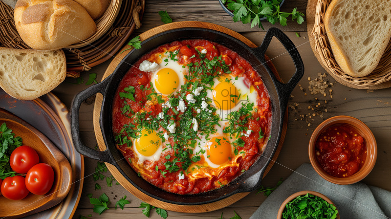 Israeli Shakshuka served in a skillet with crusty bread on the side, and adorned with fresh herbs.