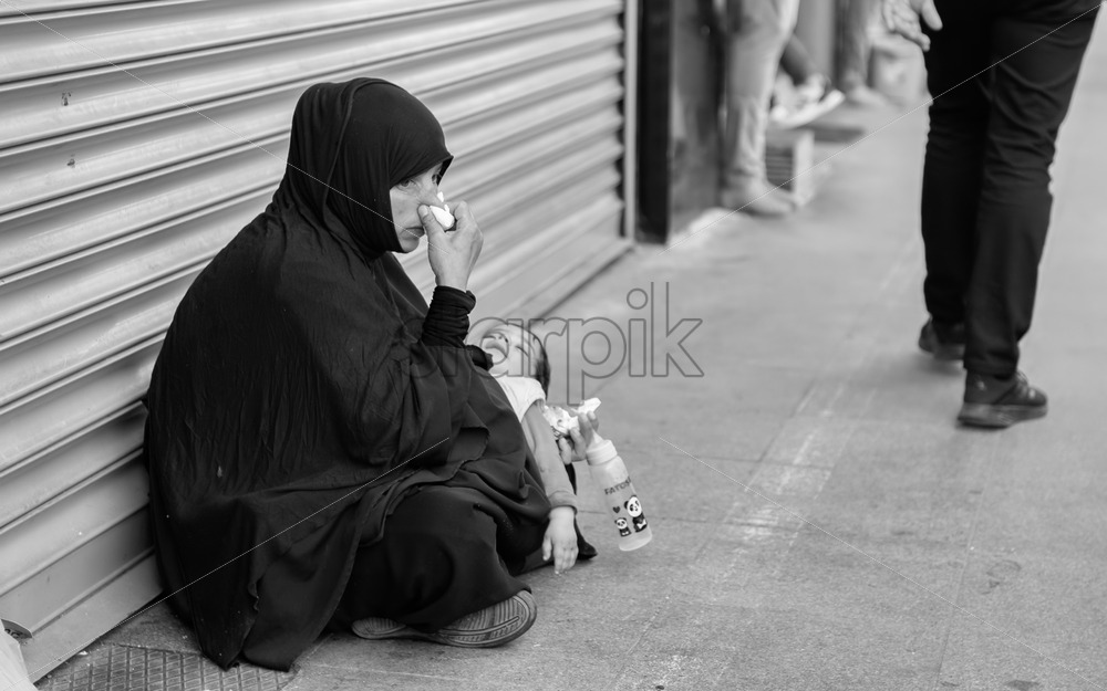 ISTANBUL, TURKEY – APRIL 2022: Homeless muslim woman with a baby in her hands crying at the corner of the street