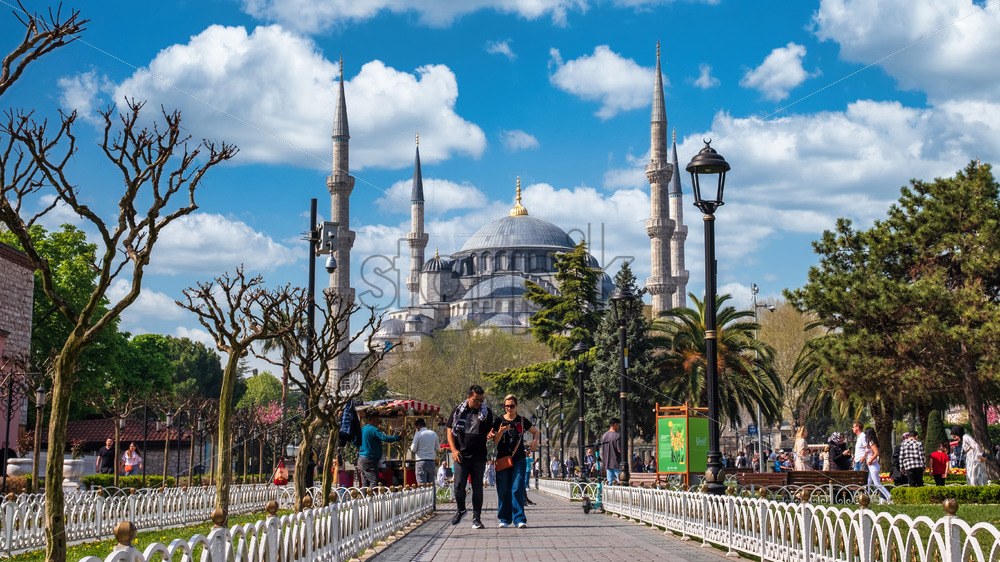 Aerial drone view of Istanbul, Turkey. The Blue Mosque and Hagia Sophia with gardens and residential buildings, Bosporus strait and cityscape on the background