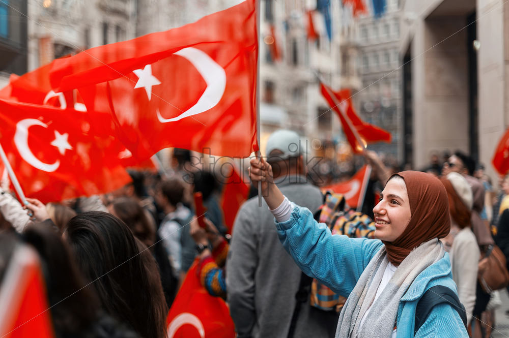 ISTANBUL, TURKEY – MAY 2023: A woman waving turkish flag in the street at the Commemoration of Ataturk, Youth and Sports Day