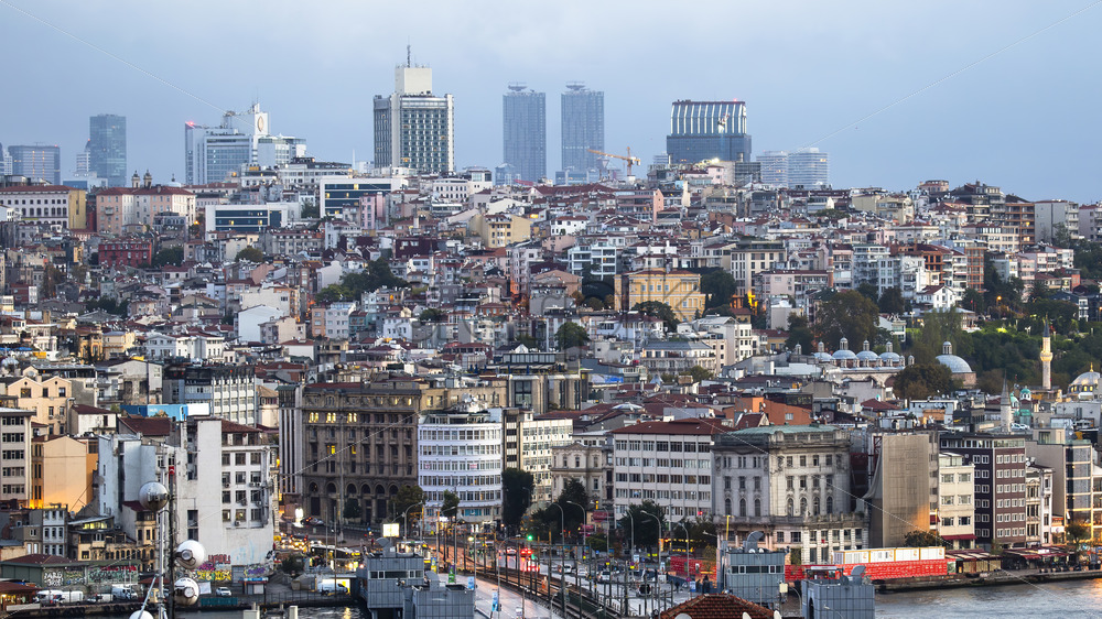 ISTANBUL, TURKEY – OCTOBER 21, 2020: A lot of low residential and high modern buildings in the distance, bridge on the foreground and cloudy sky