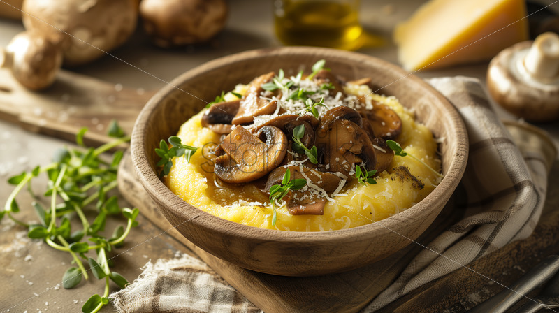 A rustic photograph featuring Italian Polenta, a hearty cornmeal porridge often served with mushrooms and Parmesan cheese.