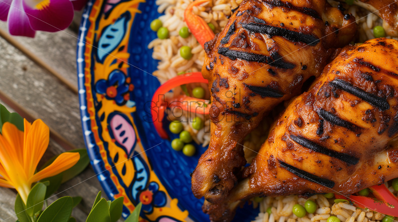 A flavorful image showcasing Jamaican Jerk Chicken, grilled with a flavorful spice rub, served with rice and peas.