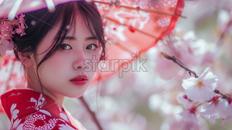 Japanese woman in a cherry orchard, traditional dress, spring blossom