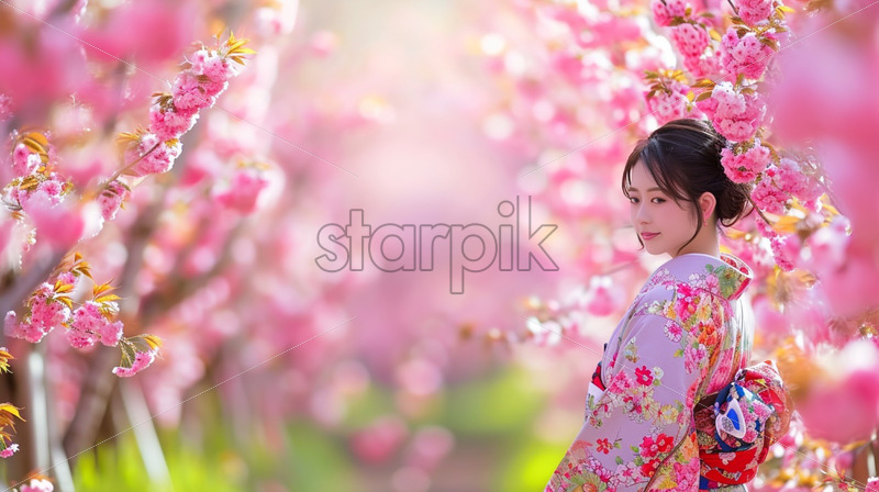 Japanese woman in a cherry orchard, traditional dress, spring blossom