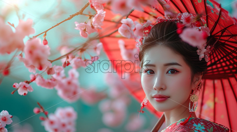 Japanese woman in a cherry orchard, traditional dress, spring blossom