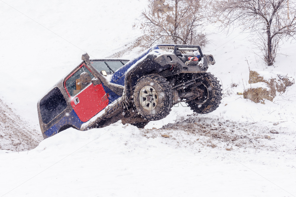 Jeeps compeating in winter rally competition with mud and snow. Magdacesti, Moldova