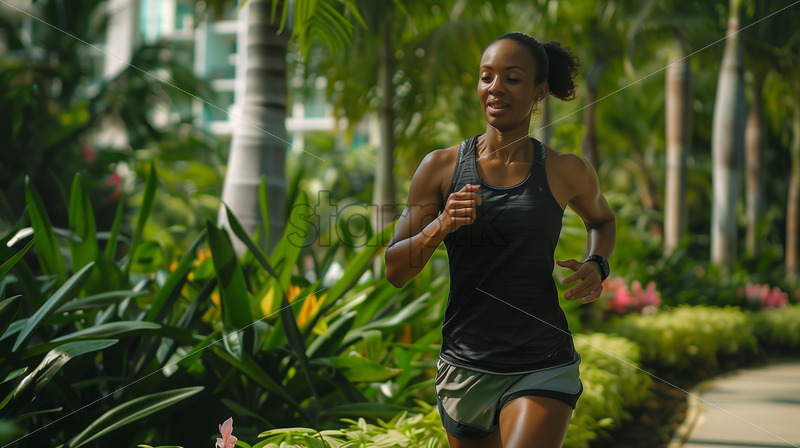 A fitness enthusiast, clad in athletic gear, jogs through a vibrant city park surrounded by lush greenery. Their face flushed with exertion and determination as they embrace the invigorating rhythm of their run.