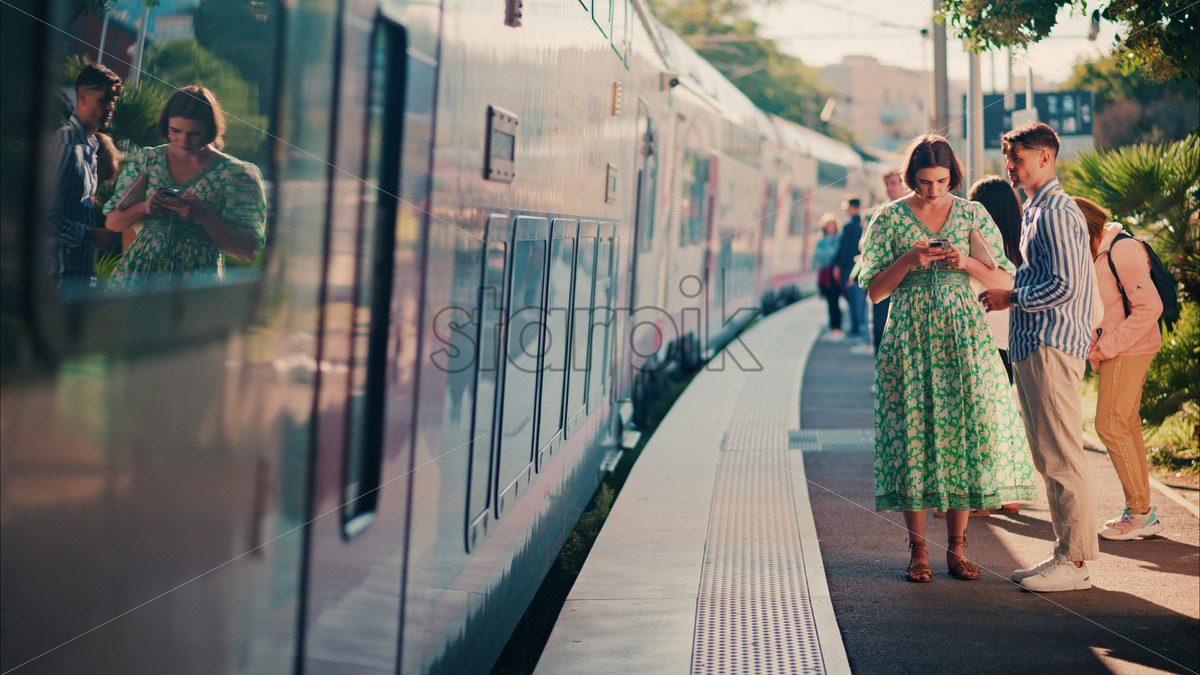 Juans les Pins, France – October 05, 2024: Young people waiting to get into an arriving train at the station, looking on mobile phones, window reflection