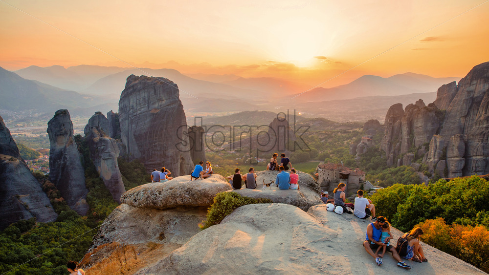 KALABAKA, GREECE – AUGUST 23, 2021: Aerial drone view of the Meteora at sunset. Rock formations with viewpoint full of people. A lot of greenery, sacred place
