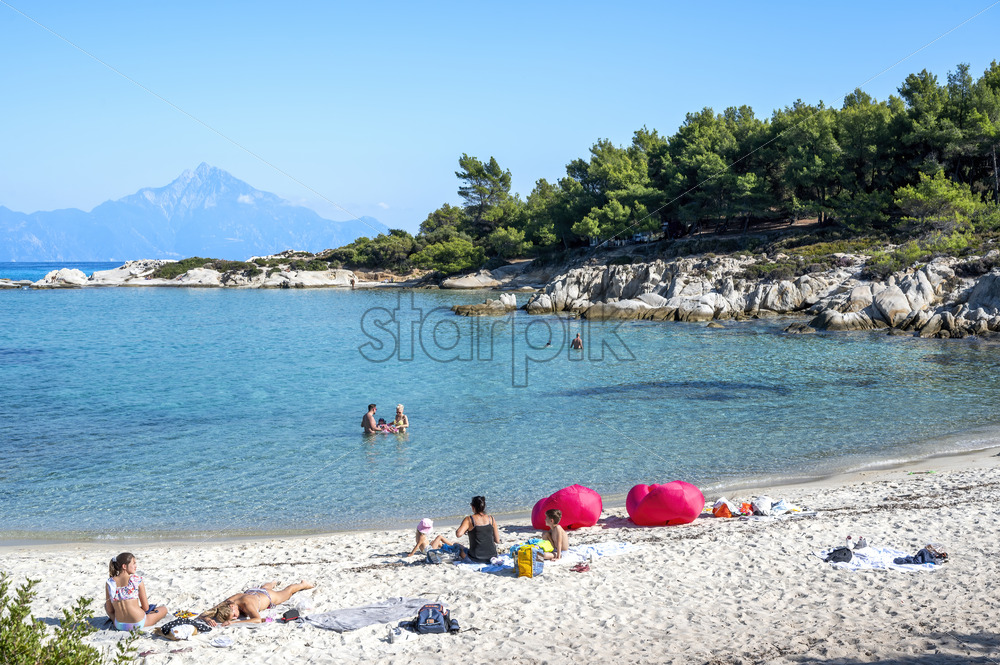 Home » Shop » photo » KARIDI, GREECE – OCTOBER 22, 2020: Aegean sea coast with lots of resting and swimming people on the beach, rocks and mountain on the background