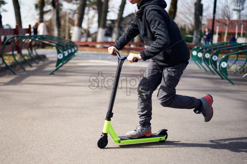 Kid riding on stunt scooter in the skatepark. Close-up shot Royalty Free Stock photo