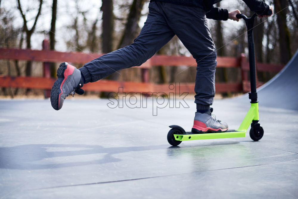 Kid riding on stunt scooter in the skatepark. Close-up shot Royalty Free Stock photo