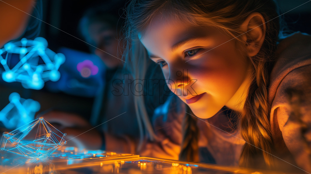 children use holographic tablets powered by quantum computing, displaying interactive 3D models
