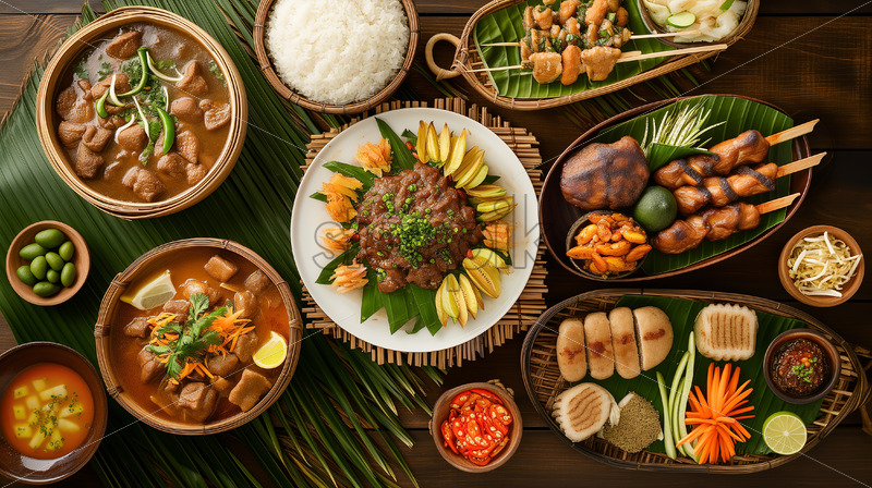 A mesmerizing food photography of diverse Filipino Kinunot dishes in wooden bowls, set on a bamboo mat with banana leaves, showcasing native-style aesthetics, vibrant colors, a savory allure, and tasteful sprinkles of chili and onion leaves, captured from a top-down center angle for a visually engaging presentation.