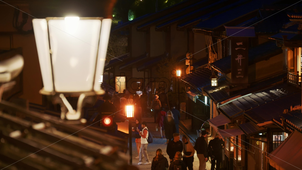 Kyoto, Japan – April 11, 2025: Close up of a street lamp with a view of people walking on the Ninenzaka stone-paved pedestrian road, lined with traditional buildings and shops in the evening Royalty Free Stock Video Footage