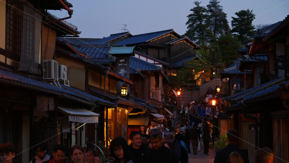 Kyoto, Japan – April 11, 2025: People walking through Ninenzaka stone-paved pedestrian road, lined with traditional buildings and shops in the evening. Translation: “Dead end ahead” Royalty Free Stock Video Footage