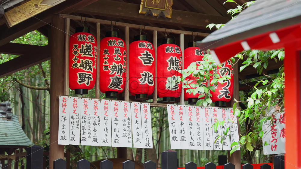 Kyoto, Japan – April 11, 2025: Red paper lanterns with omikuji hanging under them at the Arashiyama Bamboo Forest in Kyoto, Japan. Translation: “Company and people blessed names” Royalty Free Stock Video Footage