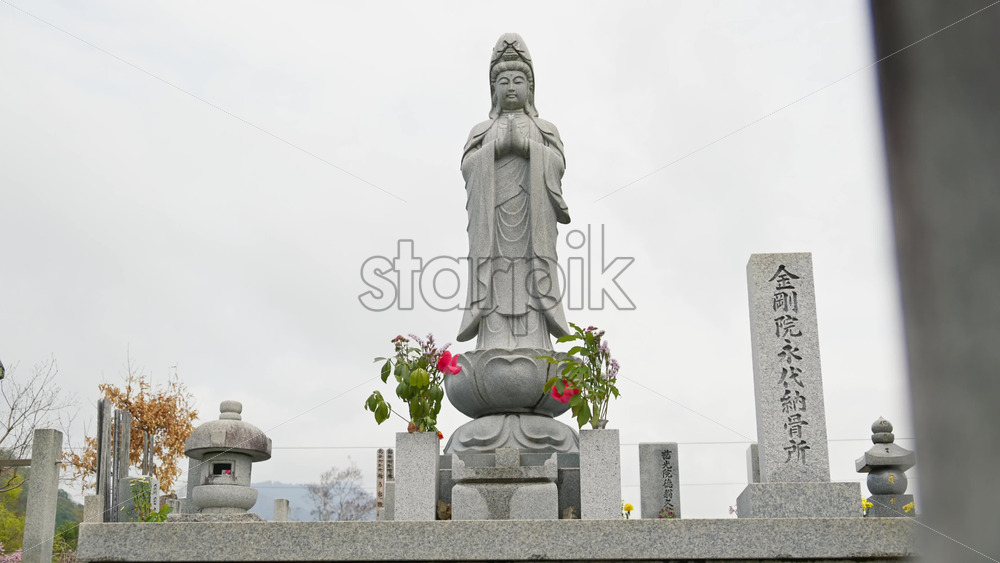 Kyoto, Japan – April 11, 2025: Stone deity sculpture in a cemetery at the Arashiyama Bamboo Forest in Kyoto, Japan. Translation: “Kongoin Temple Eternal Columbarium” Royalty Free Stock Video Footage
