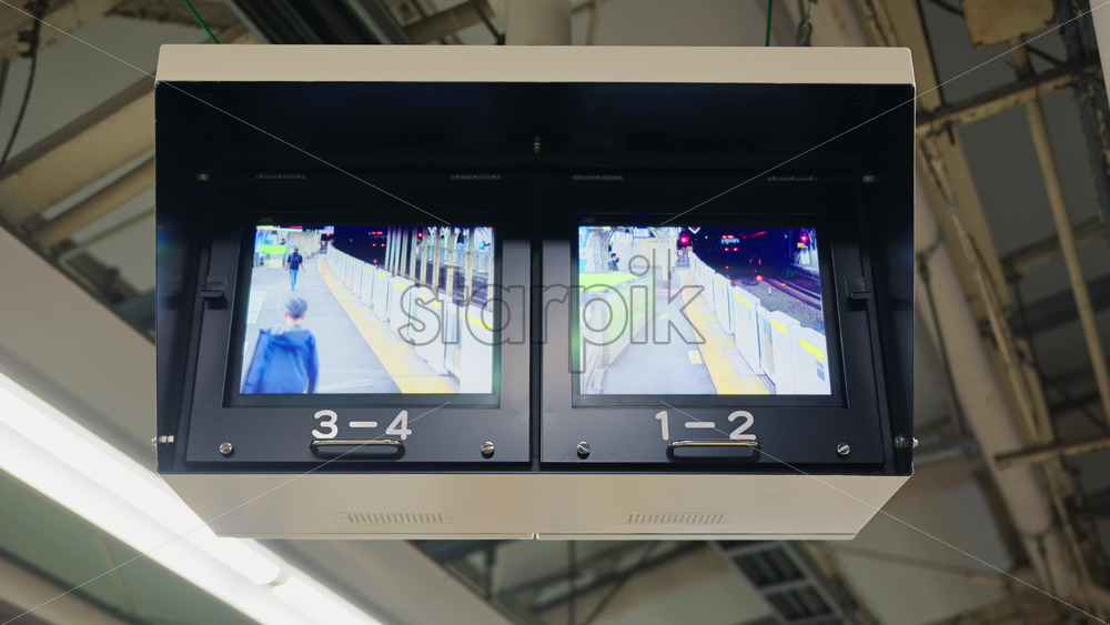 Kyoto, Japan – April 11, 2025: Two screens showing the railway station in the evening in Tokyo, Japan Royalty Free Stock Video Footage