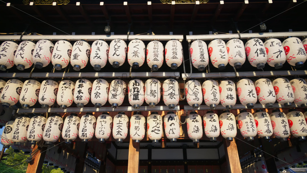 Kyoto, Japan – April 11, 2025: White paper lanterns hanging at the Yasaka Shrine at sunset. Translation: “Names of local businesses and donors” Royalty Free Stock Video Footage