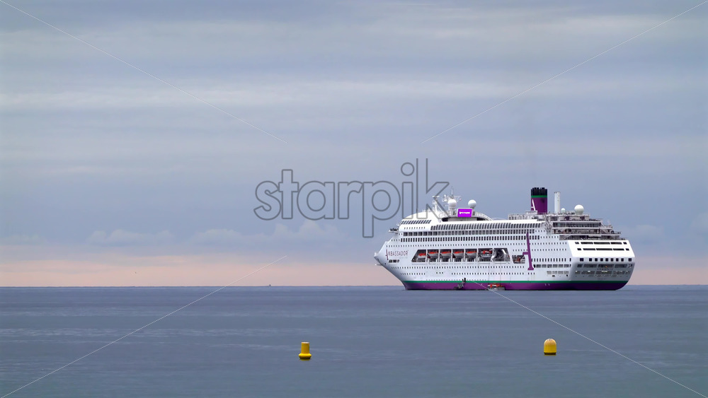La Condamine, Monaco – July 4, 2025: A white cruise ship floating on calm water with navigation buoys in front Royalty Free Stock Video Footage