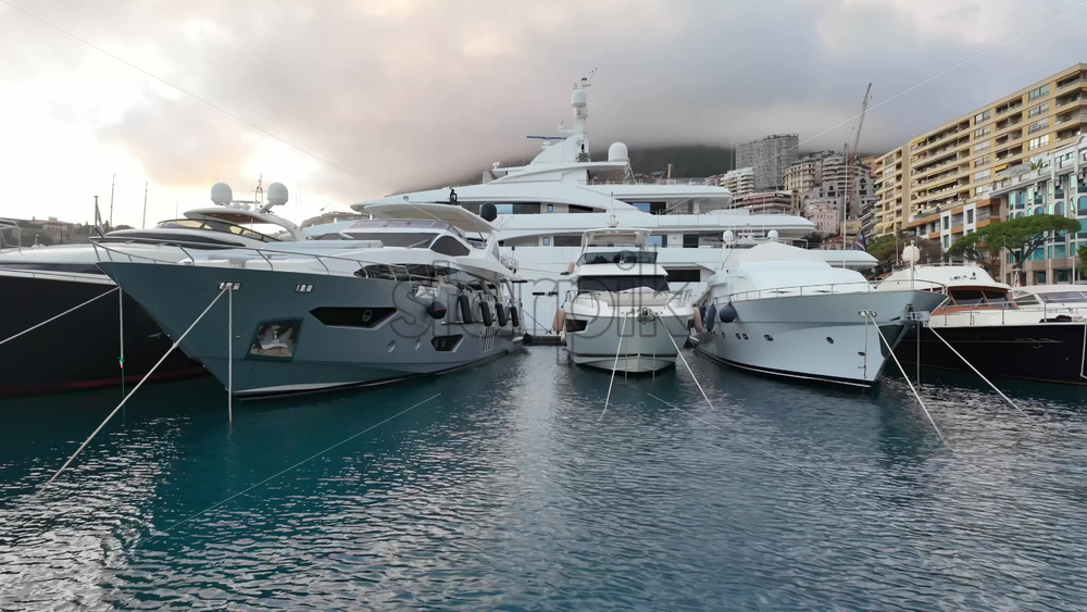 La Condamine, Monaco – July 4, 2025: Row of sleek luxury yachts, docked in Port Hercules with the Monaco cityscape and misty hills in the background Royalty Free Stock Video Footage