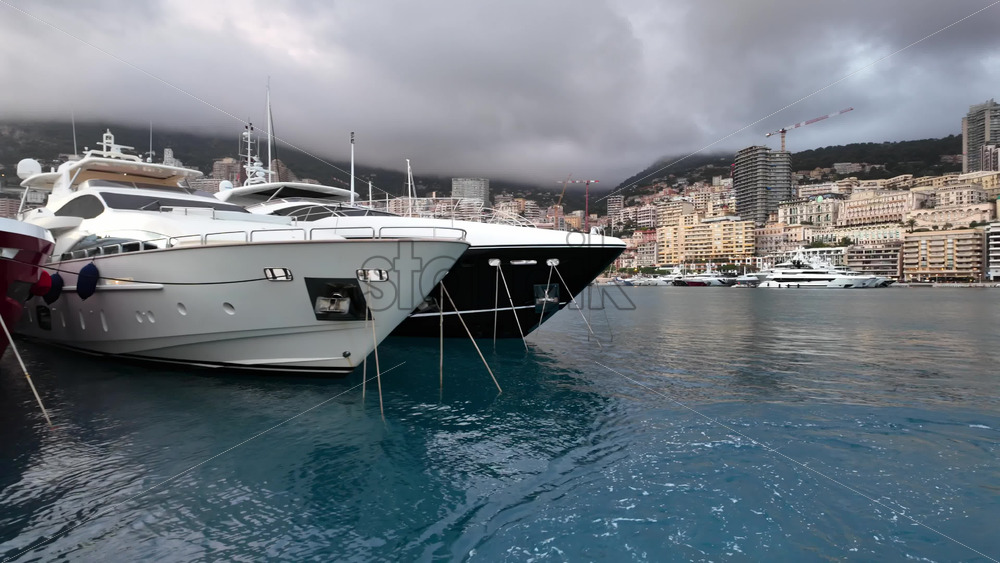 La Condamine, Monaco – July 4, 2025: Row of sleek luxury yachts, docked in Port Hercules with the Monaco cityscape and misty hills in the background Royalty Free Stock Video Footage