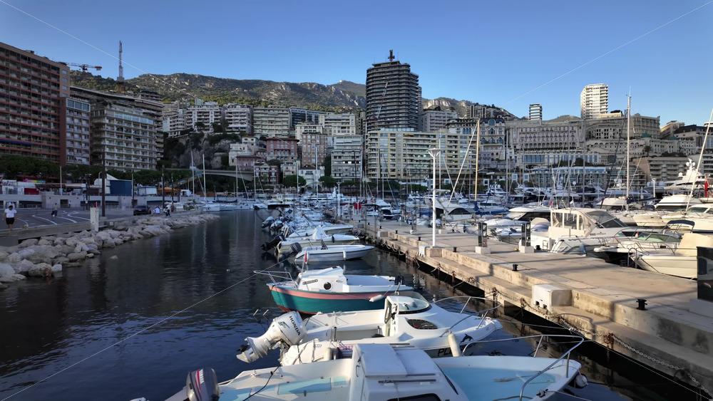 La Condamine, Monaco – July 8, 2025: Boats docked in Port Hercule with buildings on the background in the evening Royalty Free Stock Video Footage
