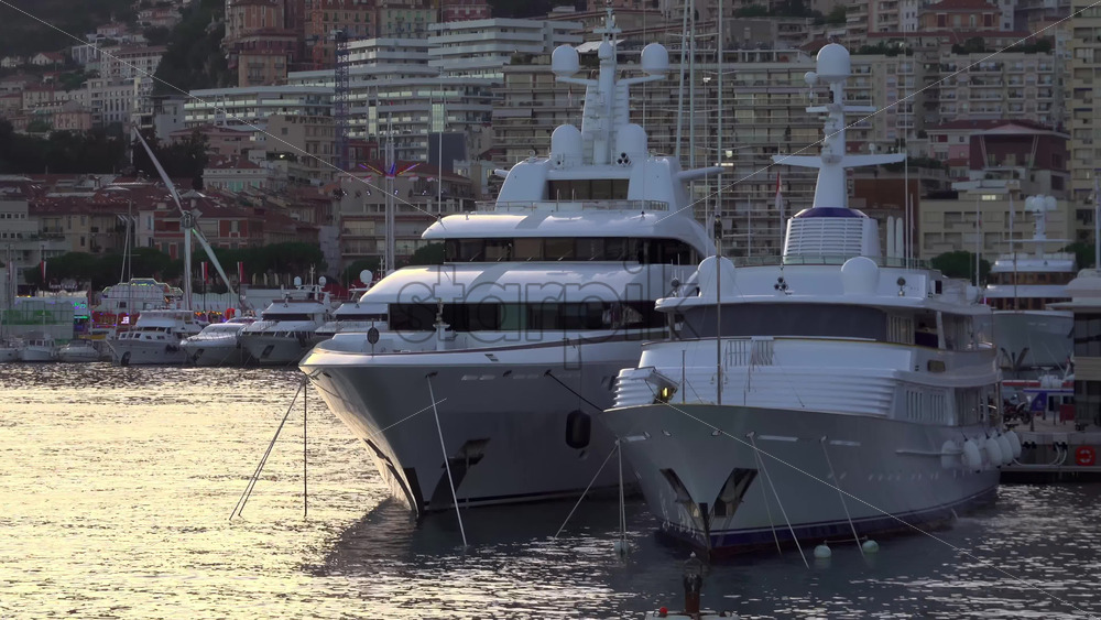 La Condamine, Monaco – July 8, 2025: Boats docked in Port Hercule with buildings on the background in the evening Royalty Free Stock Video Footage