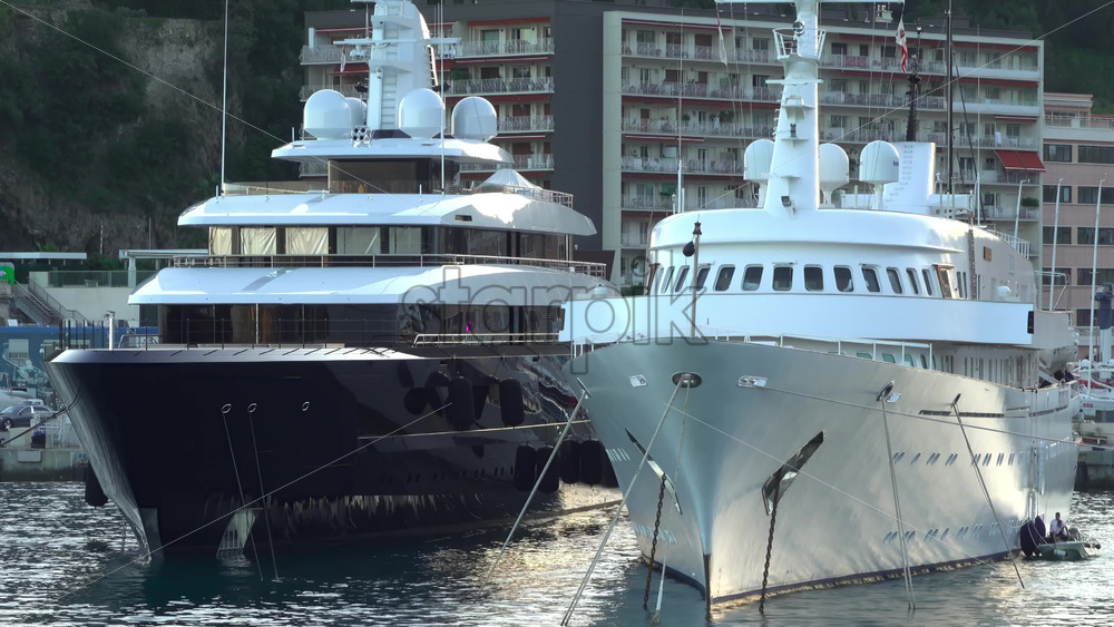 La Condamine, Monaco – July 4, 2025: Row of sleek luxury yachts, docked in Port Hercules with the Monaco cityscape and misty hills in the background Royalty Free Stock Video Footage