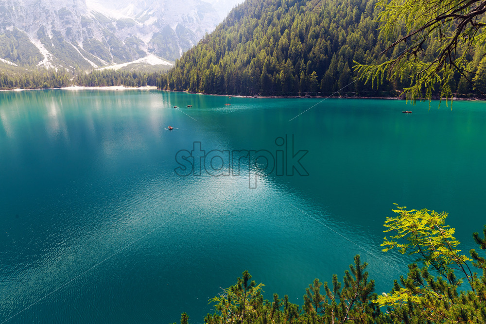 The Pragser Wildsee at daylight. Green forest on background. People on boats. South Tyrol, Italy
