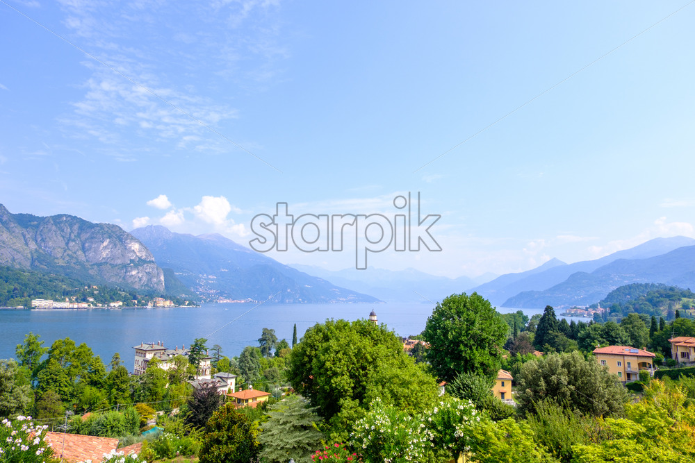 Lake Como with mountains and city buildings. Blue sky on background. Bellagio, Italy Royalty Free Stock photo