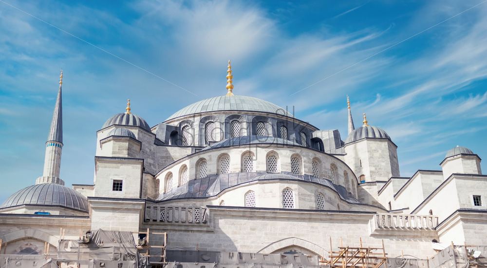 Aerial drone view of Istanbul, Turkey. The Blue Mosque and Hagia Sophia with gardens and residential buildings, Bosporus strait and cityscape on the background