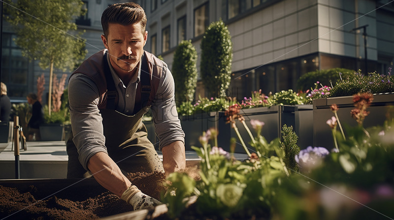 Focus landscapers man doing his job planting plants and landscaping in front of the building of client wearing his landscapers attire and gloves